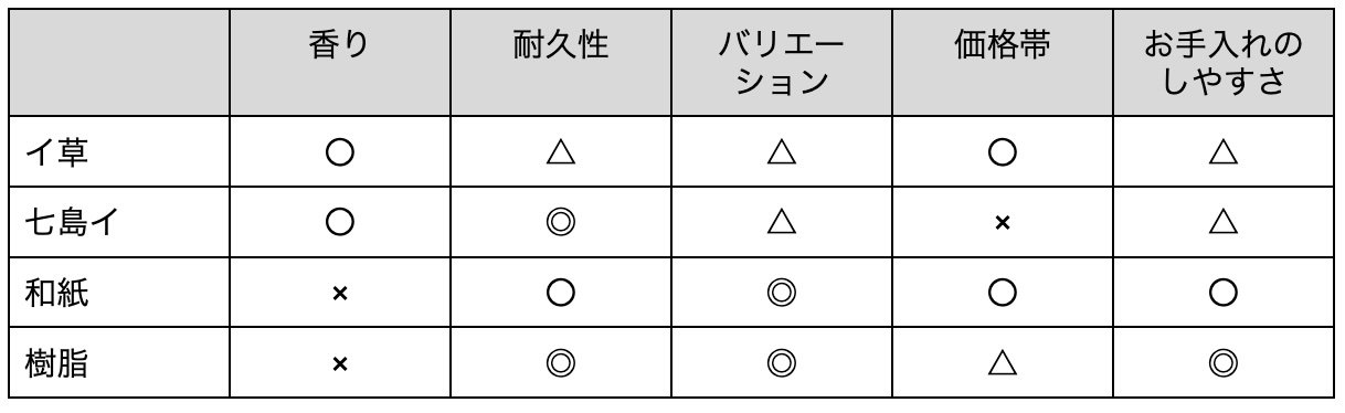 畳表(畳の表面部分)は、使われている素材によって、見た目も機能も変わります。それぞれの特徴を知れば、部屋の用途や好みに合ったものを選びやすくなります。