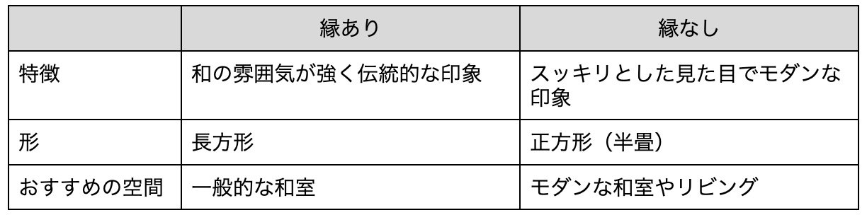畳は「縁あり」と「縁なし」の2種類の仕上げ方法があります。縁ありとは、昔ながらの和室で一般的な、畳の長辺に布の縁が付いている畳です。縁なしとは、布の縁がない畳のことで、琉球畳のような正方形(半畳)タイプの畳でよく見られます。