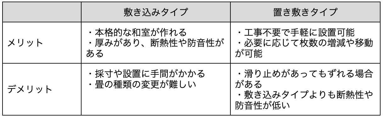 畳の設置方法には、大きく分けて「敷き込みタイプ」と「置き敷きタイプ」の2種類があります。