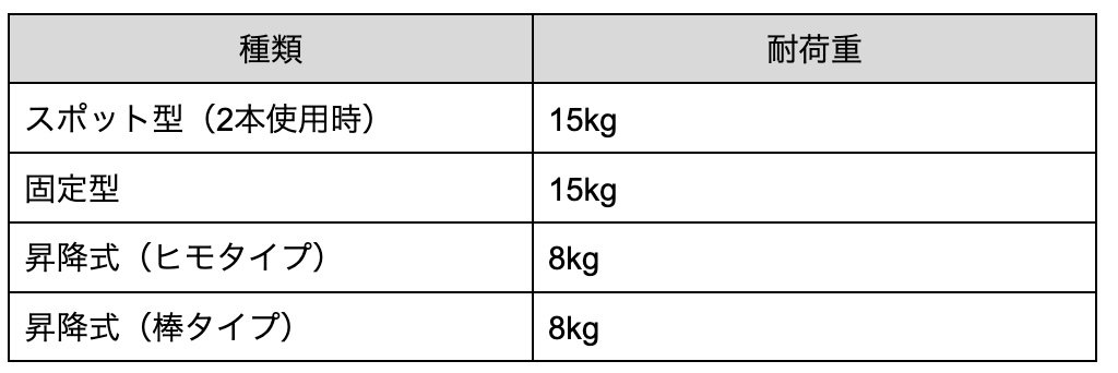 ホスクリーンの耐荷重は、種類によって異なります。スポット型は、2本使用して物干し竿を渡して使うのが一般的なため、ここでは2本使用時の耐荷重を提示しています。