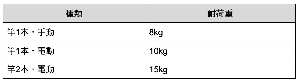 もし規定の重さを超えてしまった場合、自動で昇降を停止します。手動タイプも、質量オーバーだと竿が上がらないので安心です。無理な動作を止めることで、故障や落下事故を防いでくれます。