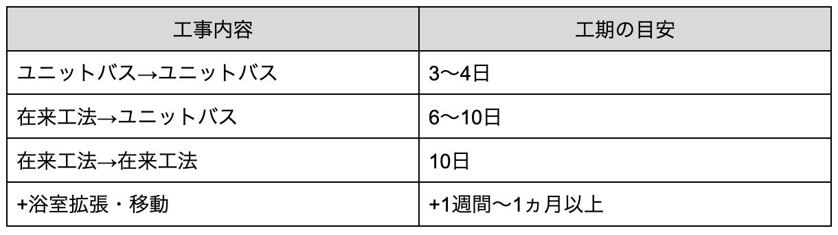 どちらのケースも解体・配管・下地づくりなどの工程が通常より増えるため、一般的な浴室交換より長い工期を見込んでおくと安心です。