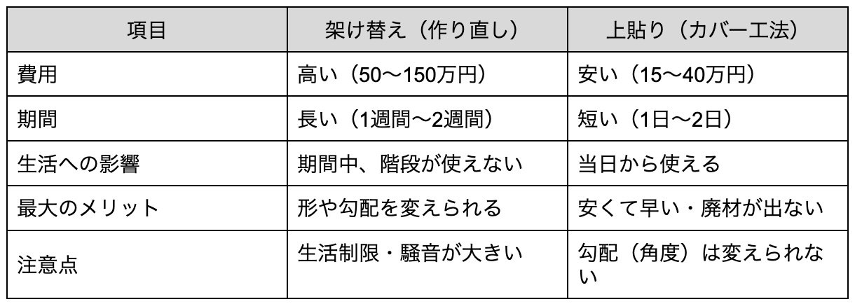 徹底比較!古い階段の「架け替え」と「上貼り」の費用・工期・特徴