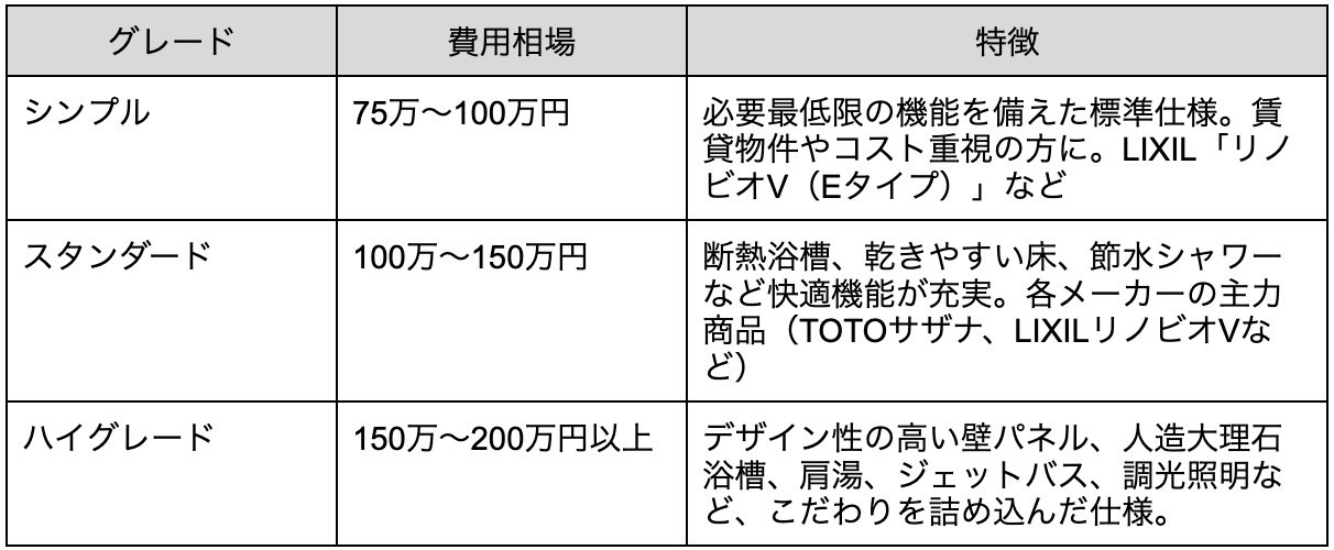 浴室リフォームのグレード別費用相場