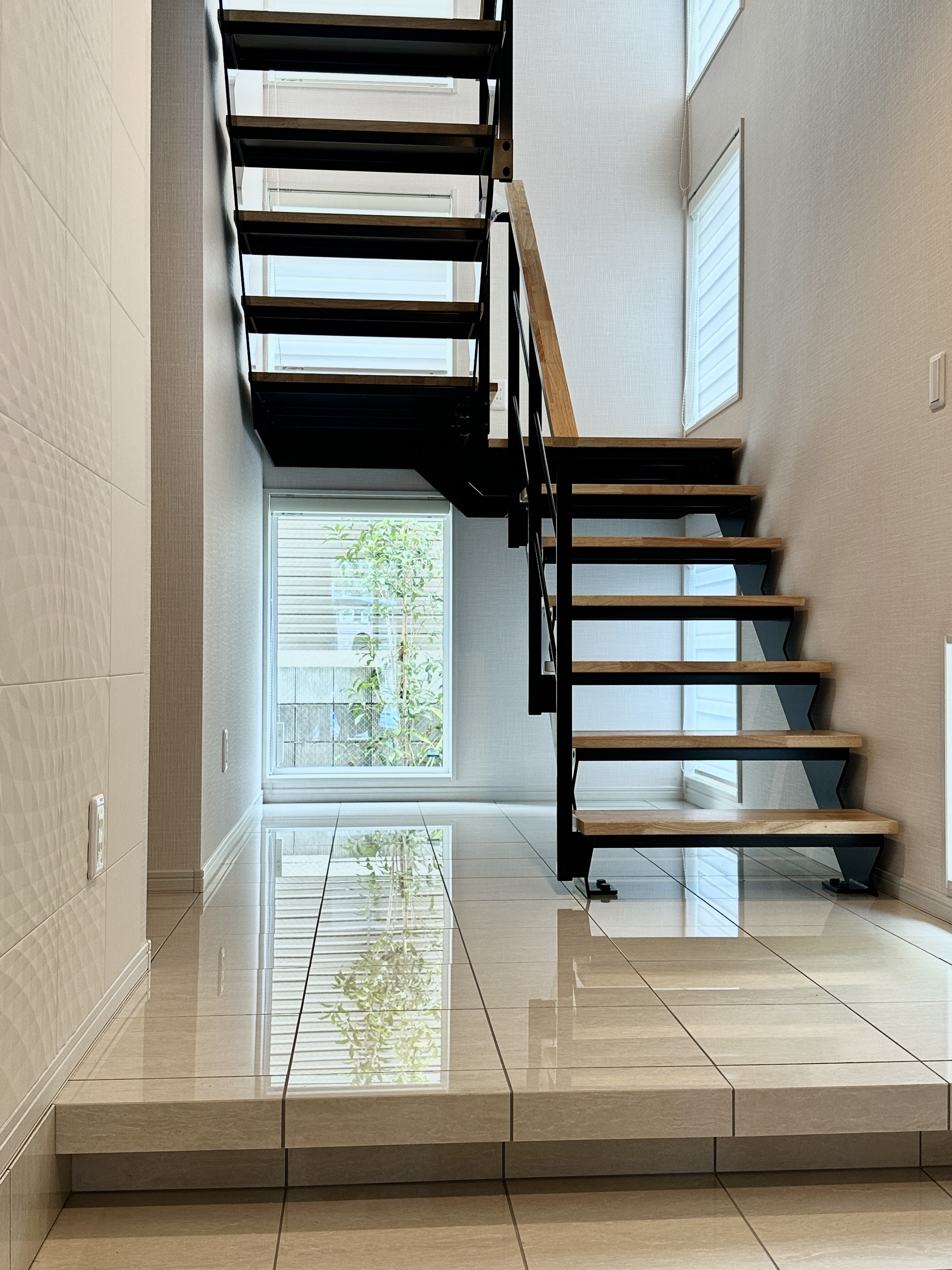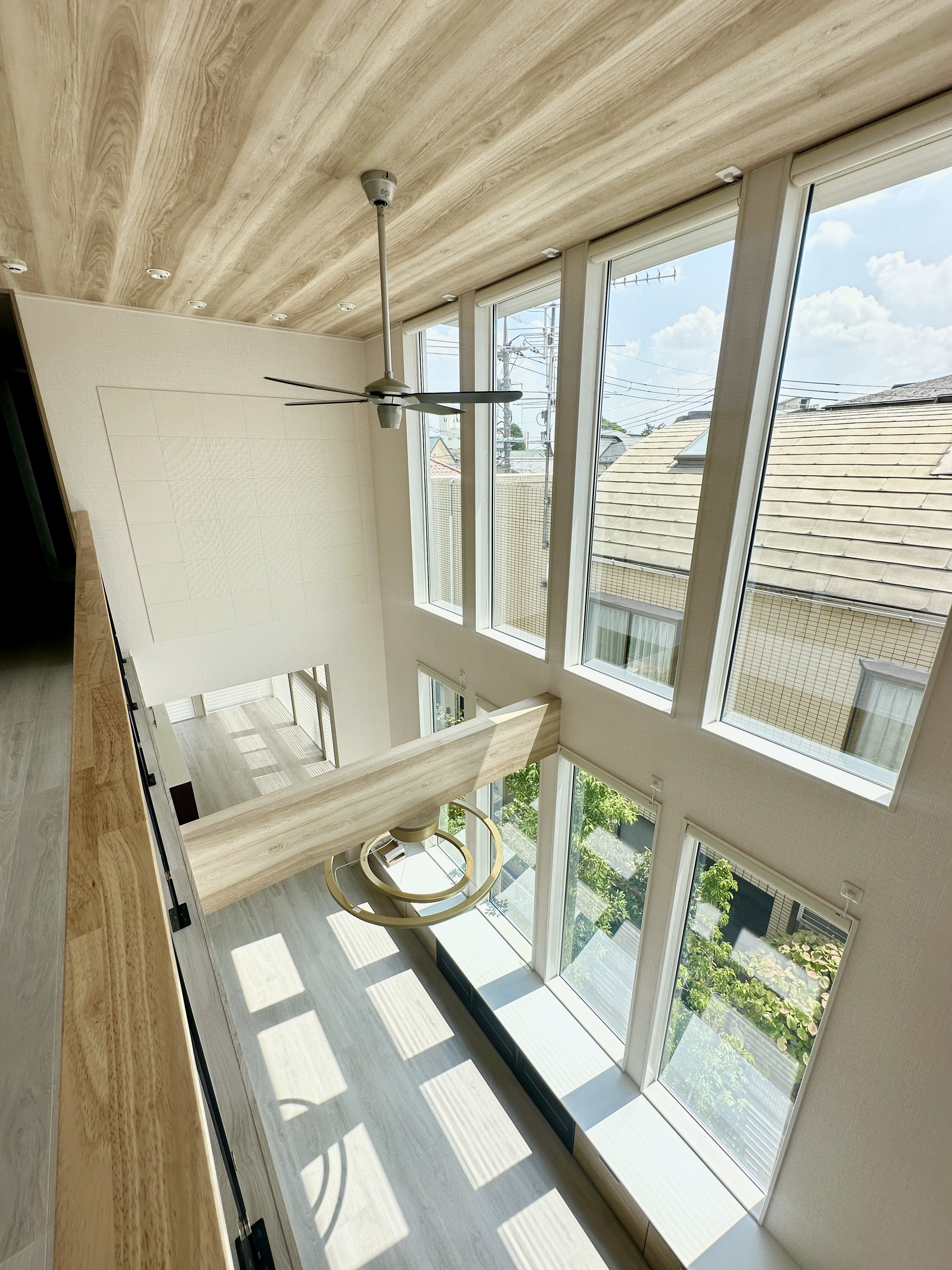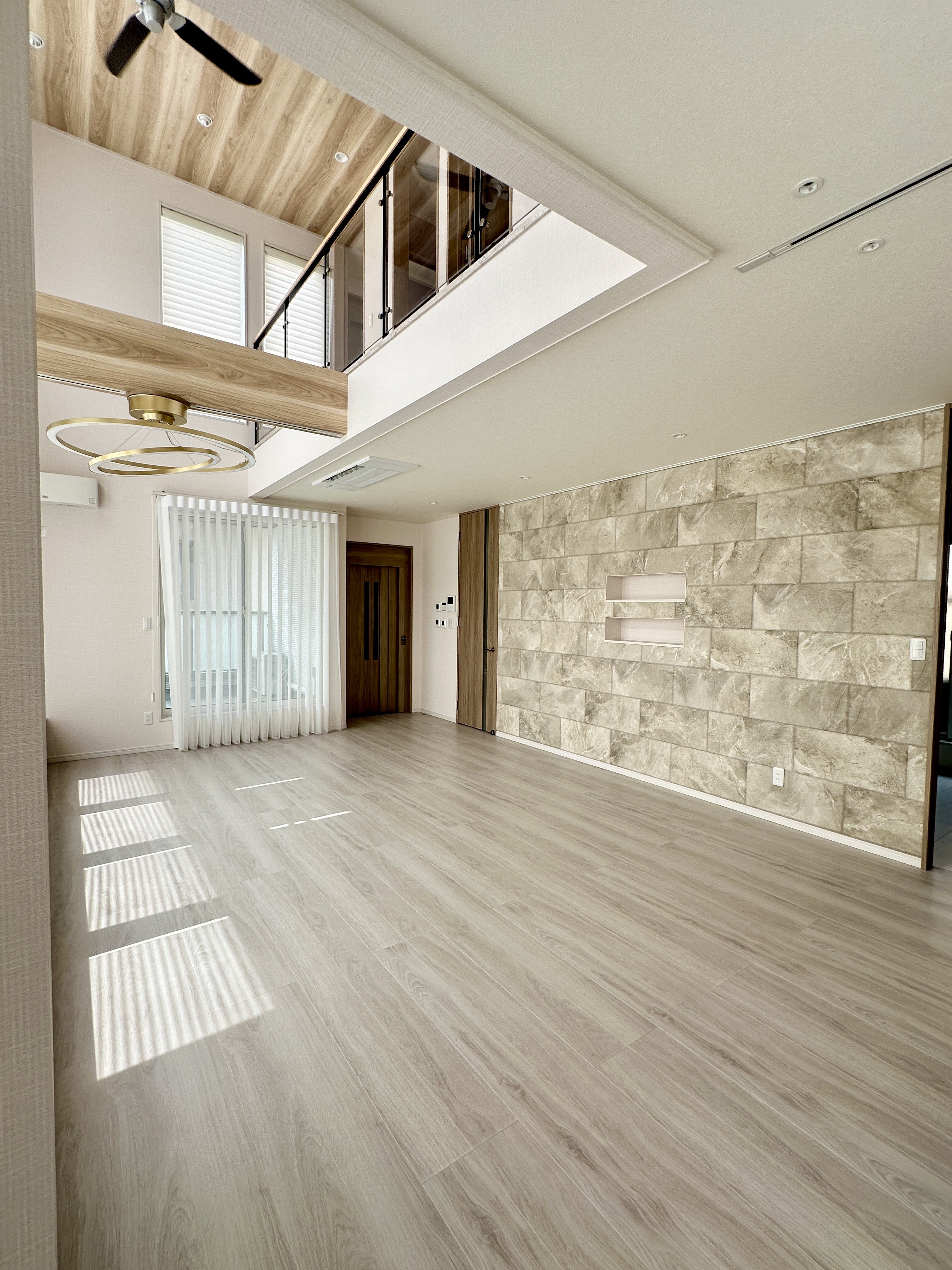 開放感あふれる吹き抜けリビングと、光をたっぷり取り込む窓配置が魅力の住まい。
